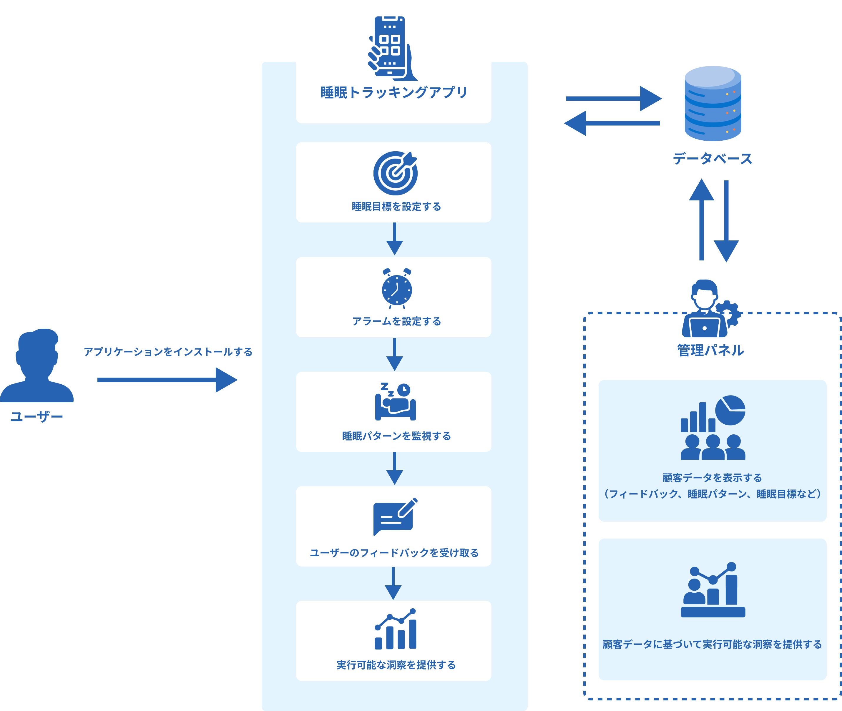 Innovature は、ユーザーの睡眠パターンを監視し、人工知能とフィードバック キャプチャ システムを統合した目覚まし時計を通じて睡眠ログ レポートを生成できるアプリケーションを提案しました。このシステムにより、クライアントは顧客のニーズと問題点を特定、分類、優先順位付けし、対処できるようになりました。AI サブシステムは、顧客の好みに関する実用的な洞察を提供し、革新的で顧客に優しいマットレスを設計する準備を整えました。システムの仕組み: