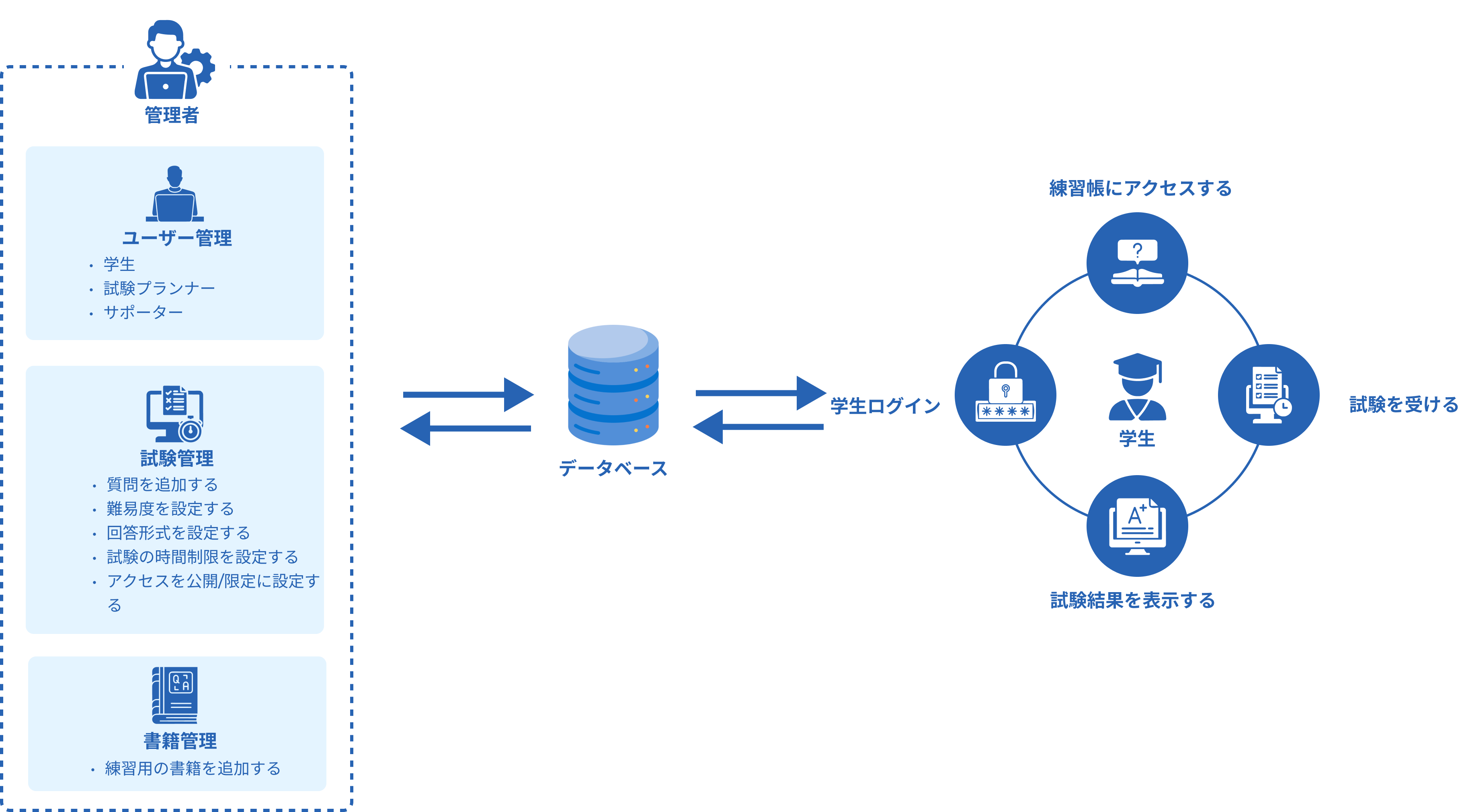 一方、学生は練習帳や試験にアクセスできます。管理者によって承認された学生のみが試験に参加できます。